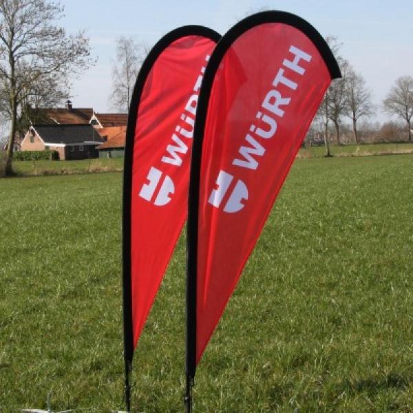 De beachflag is een geweldige mooie promotiemiddel. Snel te maken en te plaatsen. Goedkoop en in kleine oplages te verkrijgen. De beachflags worden geheel full colour bedrukt. Denk aan: beurzen, acties, evenementen, bedrijfspresentaties, product- presentaties, etc. Met een grondboor of andere houder kan de beachflag vrijwel op iedere plaats en ondergrond neergezet worden. De beweging en kleuren trekt iedereen zijn/haar aandacht en dat is wat een marketeer graag wil.
